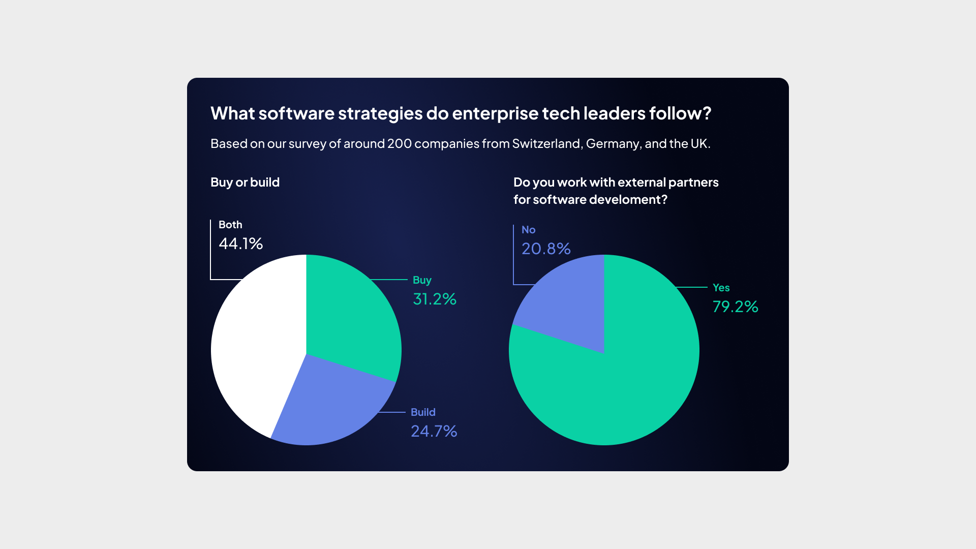 To go beyond our own analysis, Modeso commissioned original research: a survey of nearly 200 enterprise leaders across Switzerland, exploring how they approach software development decisions, whether they outsource or build in-house, whether they prefer local or international partners, and what ultimately drives their choice.