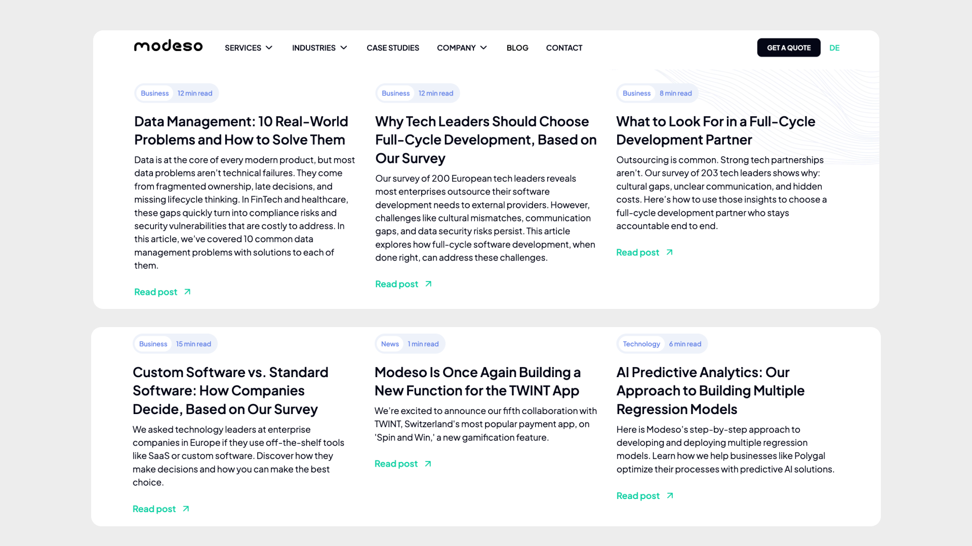 We created content around that narrowed position. Here is how I would describe it in one sentence: full-cycle development as a strategic capability (not just a delivery model), fintech outsourcing for Swiss and DACH enterprises, survey-based proprietary insights that gave Modeso credibility, and enterprise risk mitigation as a framing device for every major piece.